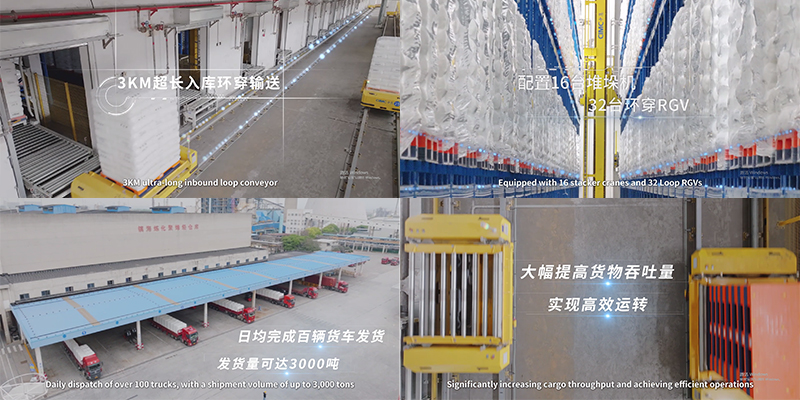 镇海炼化聚烯烃1#立体库效率提升及聚烯烃物流优化项目设计的主要依据《石油化工全厂性仓库及堆场设计规范》及《石油化工自动化立体仓库设计规范》均由我公司主编。项目改造的主要内容为:输送线由链(辊)式输送机改为RGV环形穿梭车;堆垛机、货架等设备更新,单垛货物重量从1.0吨提高为1.5吨;电控、消防、土建等配套设施改造。项目占地面积达9600平方米,配备了先进的物流设备和技术,实现了与包装产线的全自动对接,整体物流输送距离超1公里,储存量超2.5万吨。